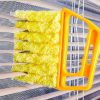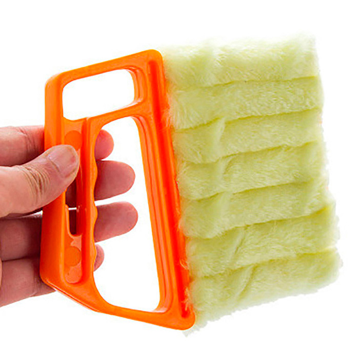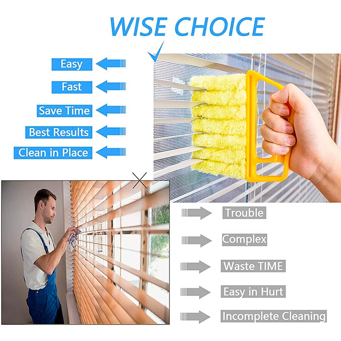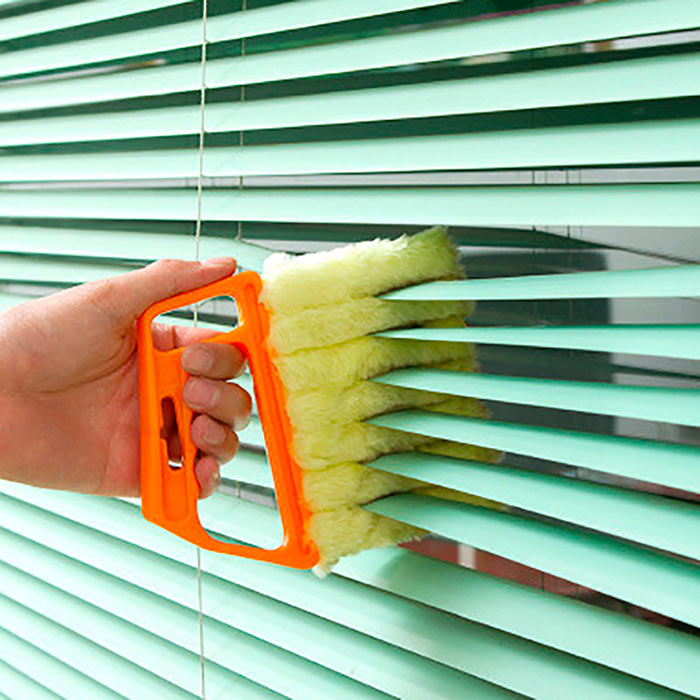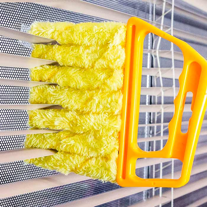 7 spazzole in microfibra combinate in 1 supporto ergonomico realizzato appositamente per la pulizia di veneziane e oggetti simili! BlindsBrush pulisce 6 file di tende, sia la parte superiore che quella inferiore contemporaneamente e le lascia perfettamente pulite con una sola passata!