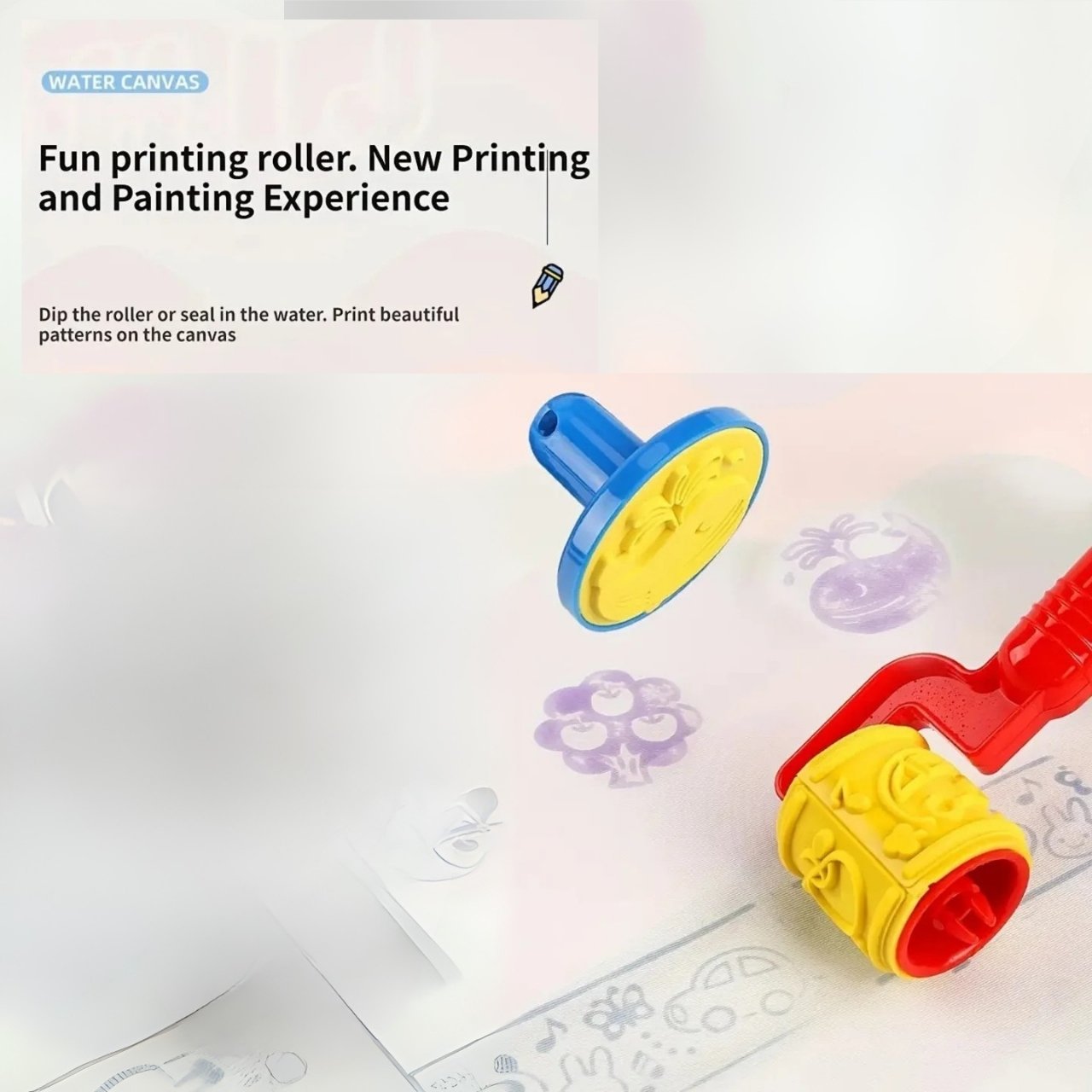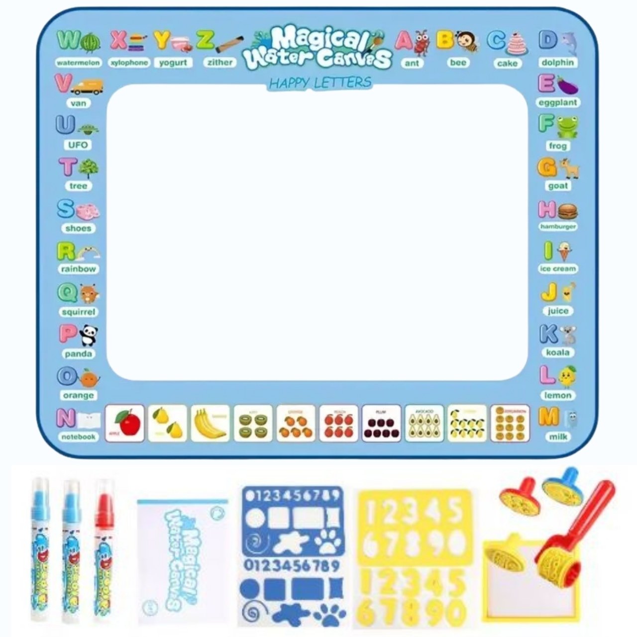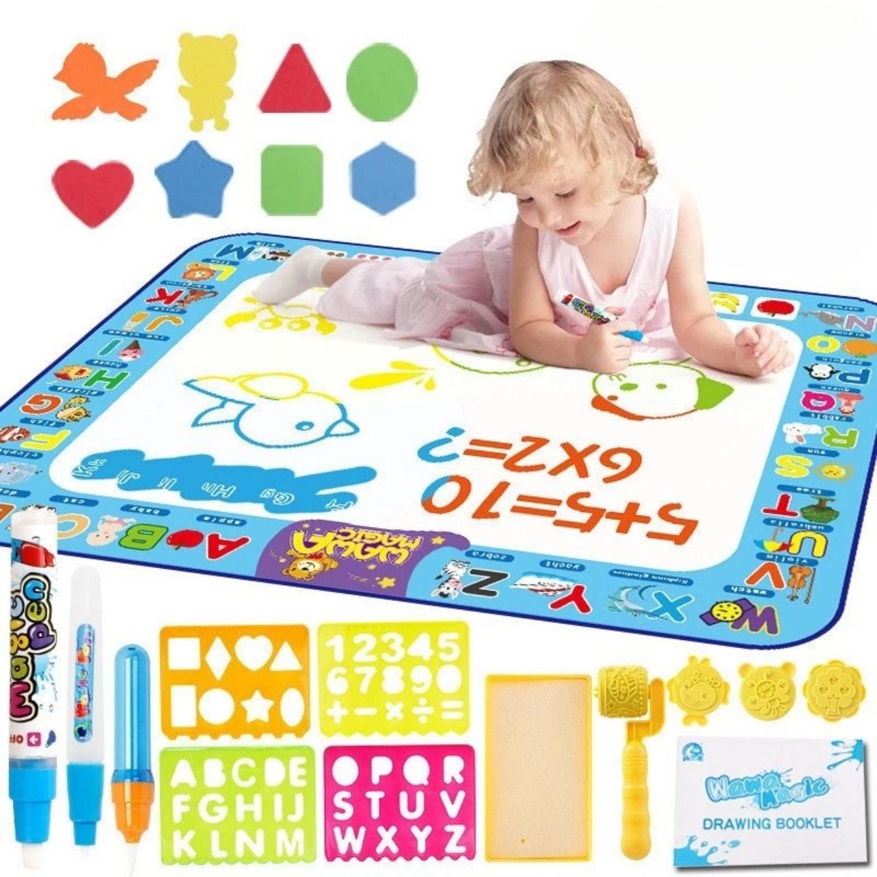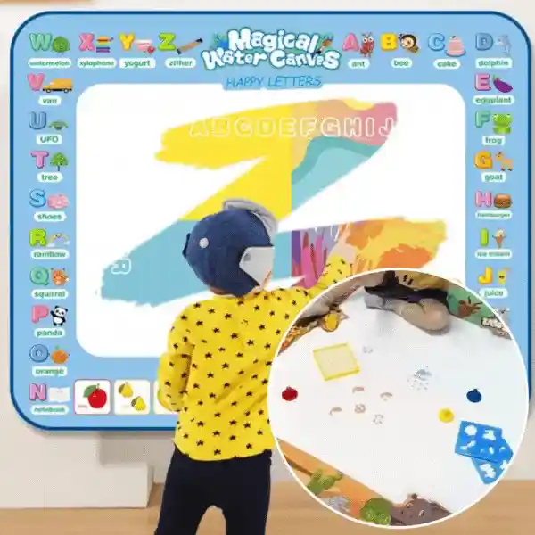 | Nel pacchetto: | 1x tappetino per disegnare con l'acqua (100 × 80 cm), 3x pennarello ad acqua, 6x stencil + rullo, 1x album da disegno, 1x contenitore per l'acqua |