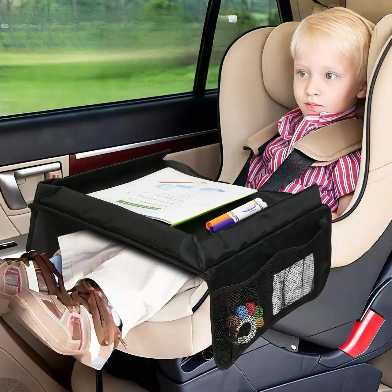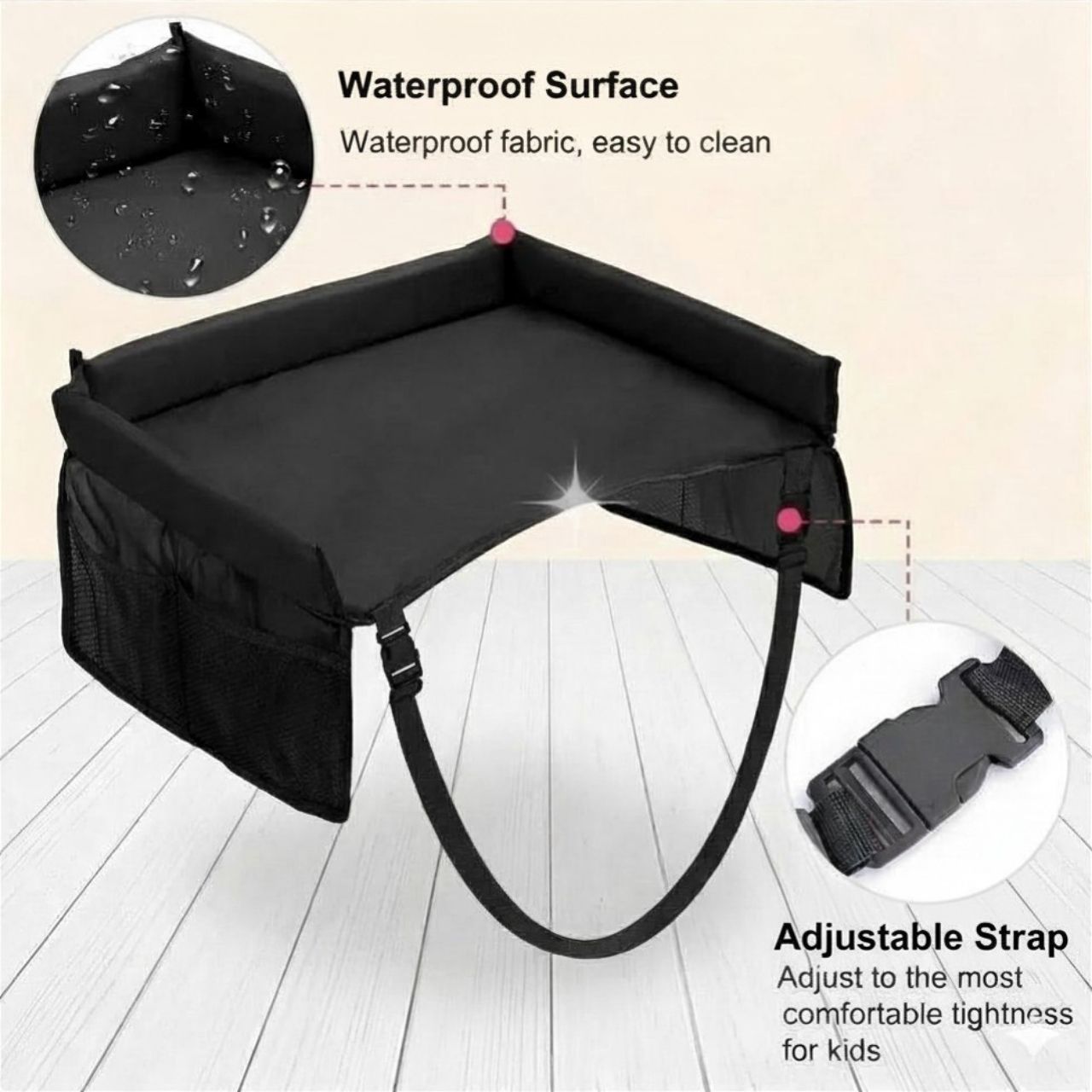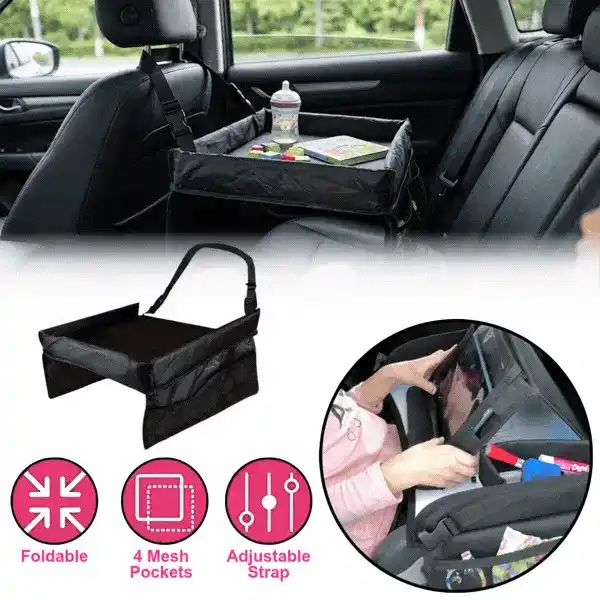 La scrivania da viaggio ha cinghie regolabili con fibbie. Semplicemente posiziona la cinghia intorno al sedile e fissala con la fibbia di sicurezza. Puoi anche regolare la lunghezza della cinghia.