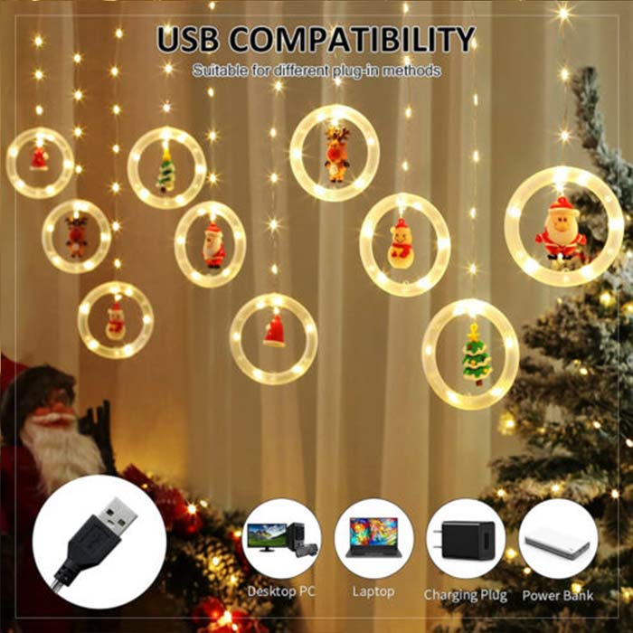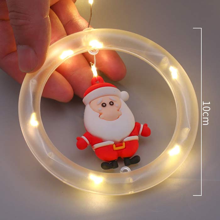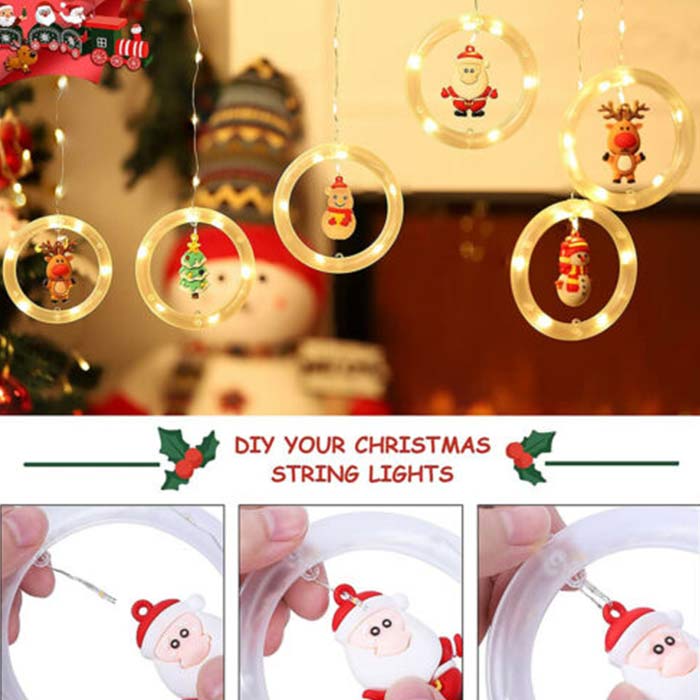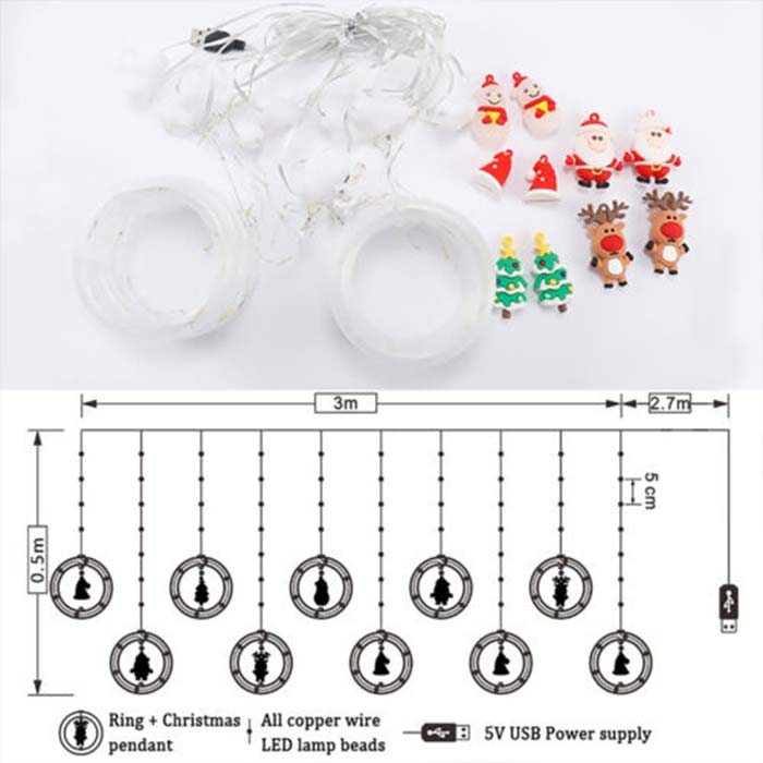 Le decorazioni di Capodanno hanno 10 strisce con luci e alla fine di ogni striscia c’รจ un anello illuminato con una figura festosa: Babbo Natale, cervo, pupazzo di neve, cappello di Natale o albero di Natale.
